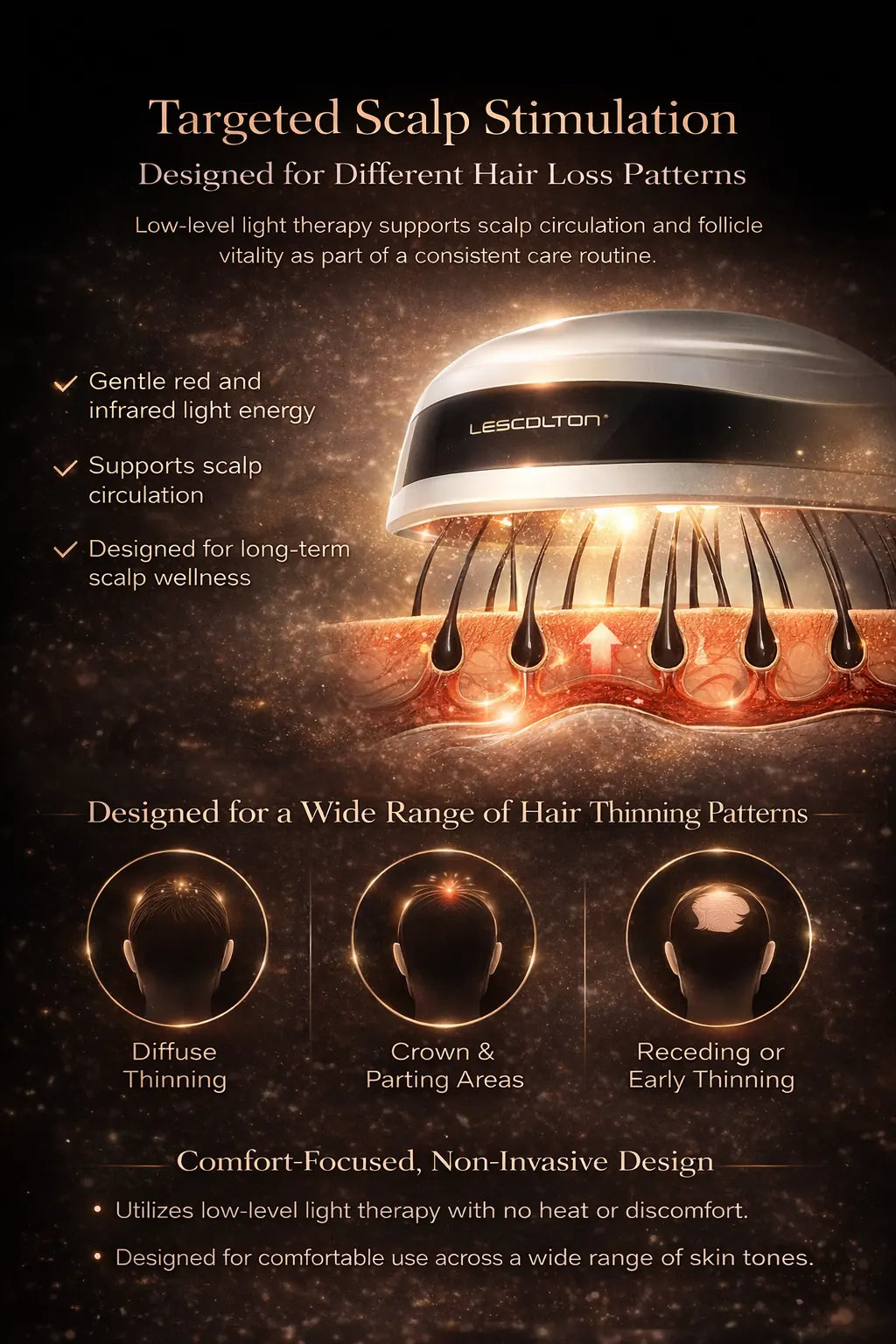 Tricholux™ Pro is engineered with low-level red light technology to reactivate the scalp environment where healthy hair growth begins. By delivering consistent, non-invasive stimulation, it helps support circulation, follicle activity, and long-term hair vitality — creating the conditions your scalp needs to grow stronger, fuller-looking hair over time.